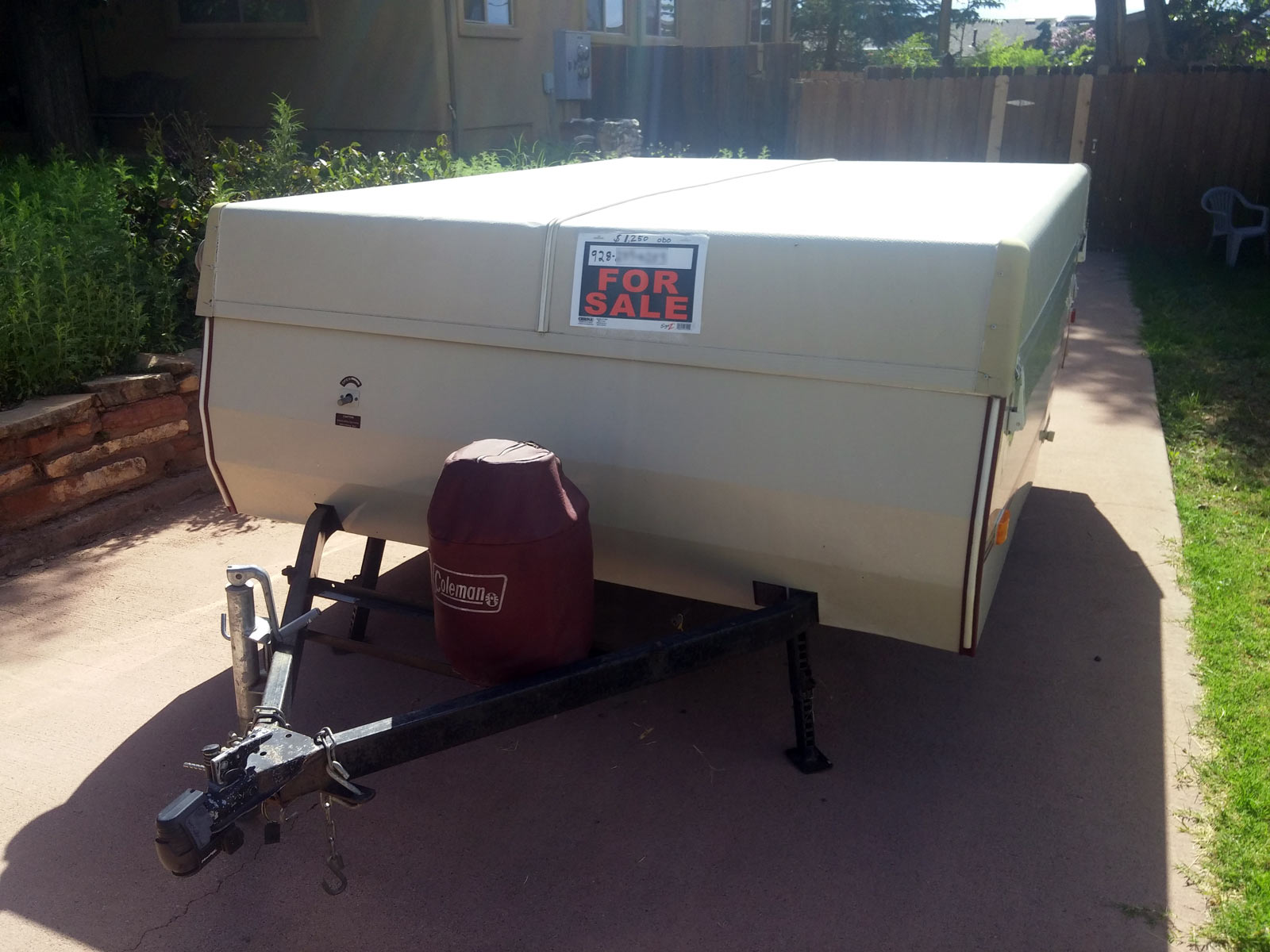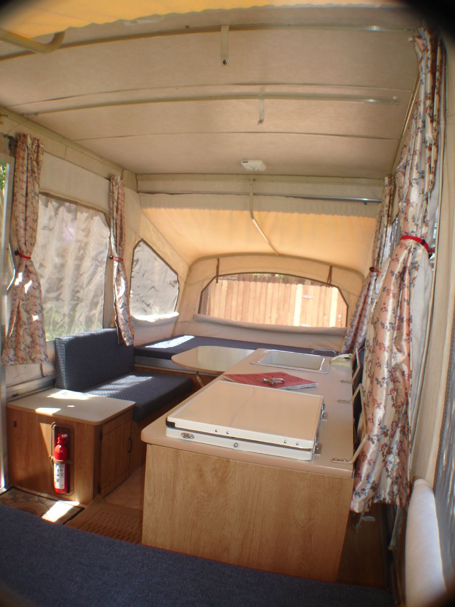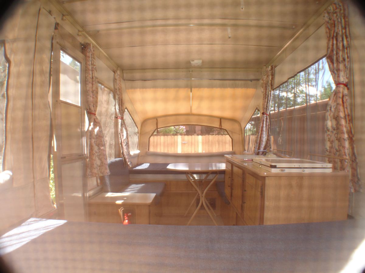 Just bought a new hard sided camping trailer and our trusty Coleman Pop Up is looking for a new home. This compact trailer folds down to a 9’L X 6.5’W X 4’H box size, and it’s light 1100 pound (1600 max) weight tows like it’s not even there. Yet is has plenty of storage and can sleep 6 comfortably. When setup, it measures 17′ long with a floor to ceiling height of 6.6′.